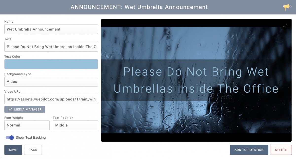 Let’s say we want to create a new signage screen to display in the entrance to our office to inform people not to bring wet umbrellas inside.